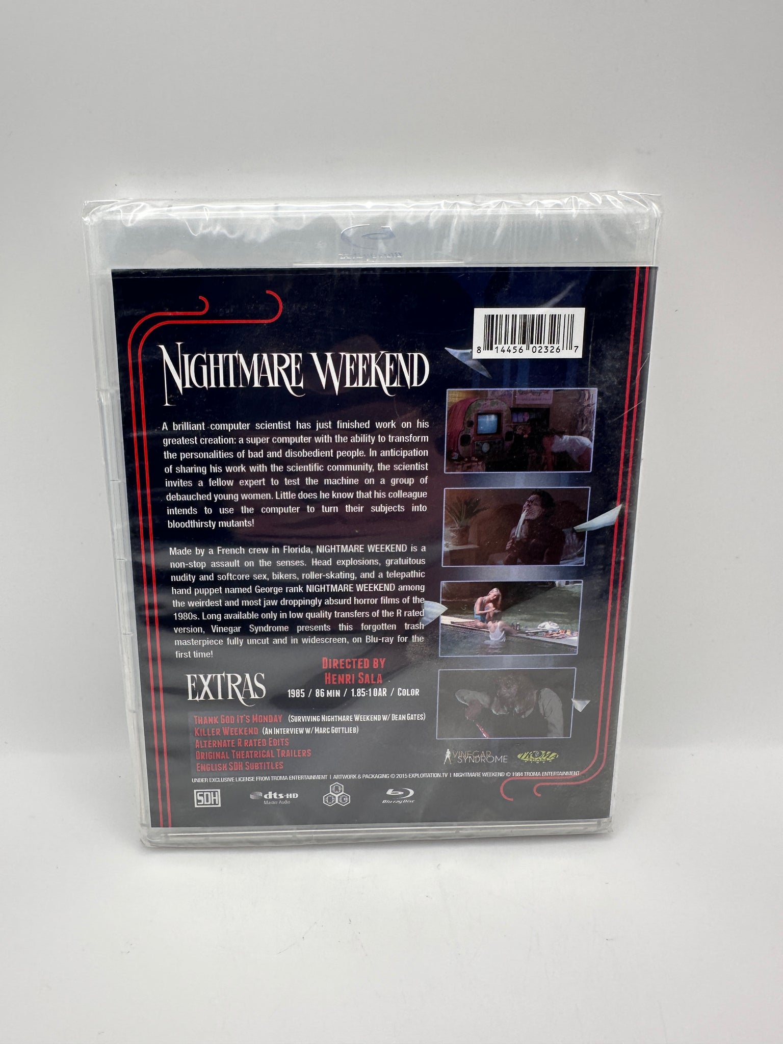 Made by a French crew in Florida, NIGHTMARE WEEKEND is a non-stop assault on the senses. Head explosions, gratuitous nudity and softcore sex, bikers, roller-skating, and a telepathic hand puppet named George rank NIGHTMARE WEEKEND among the weirdest and most jaw droppingly absurd horror films of the 1980s. Long available only in low quality transfers of the R rated version, Vinegar Syndrome presents this forgotten trash masterpiece fully uncut and in widescreen, on Blu-ray for the first time!